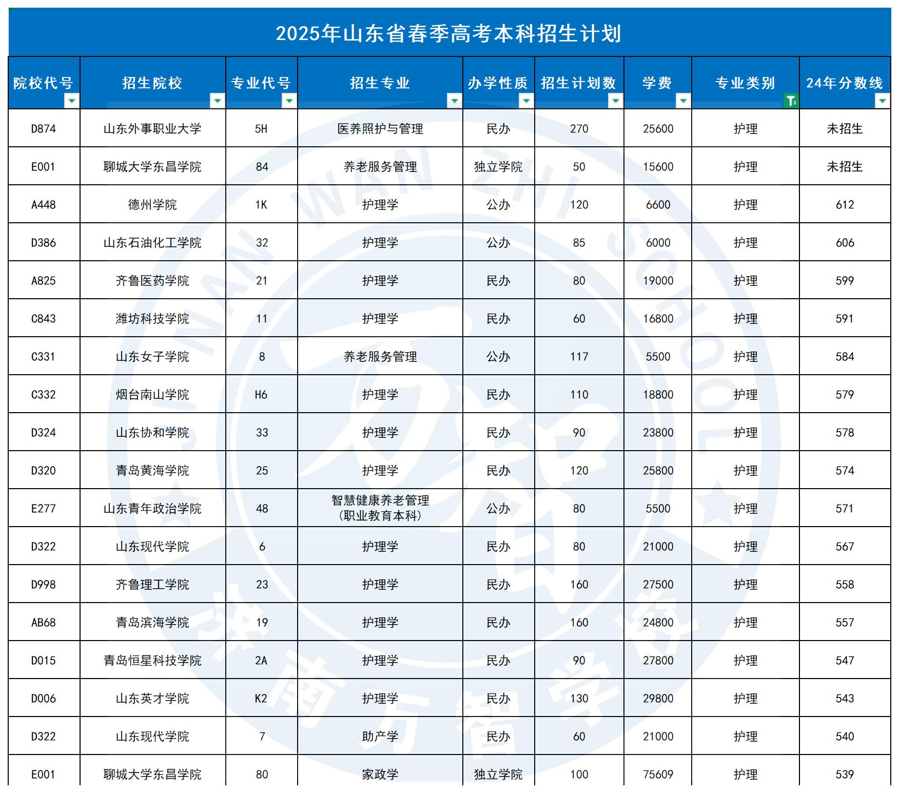 护理专业本科招生院校。完整版的2025年山东省