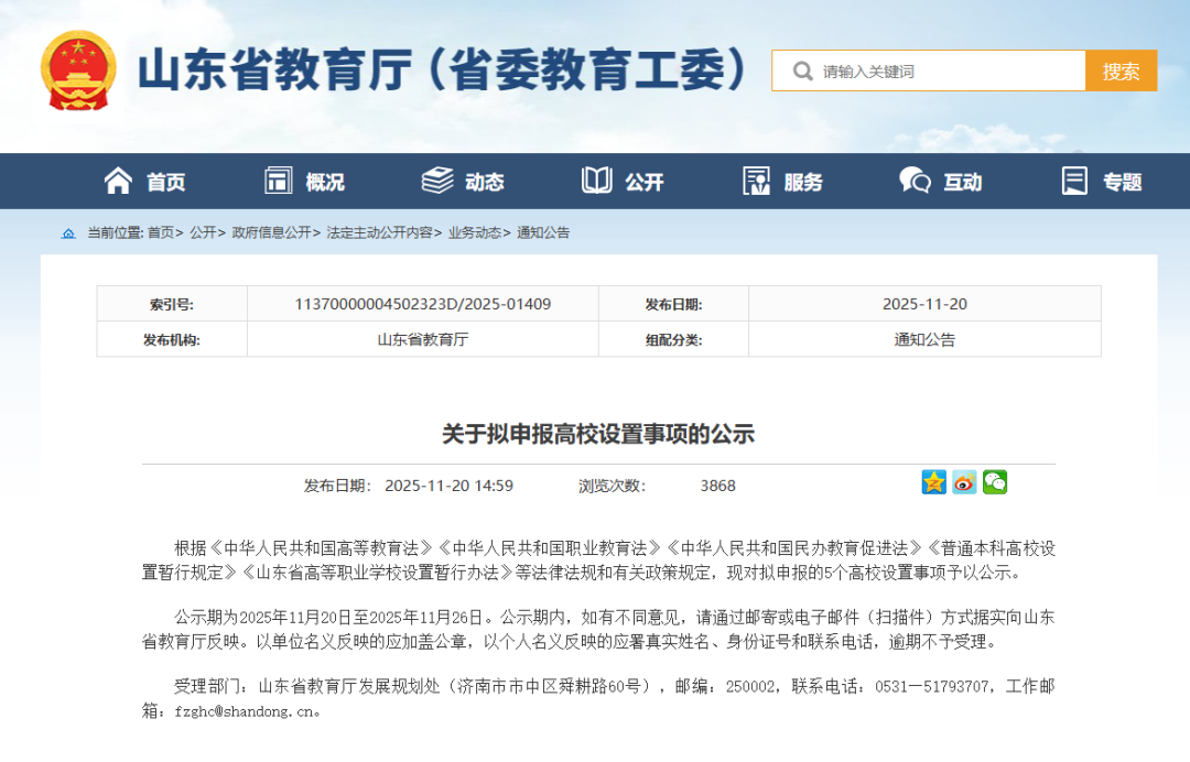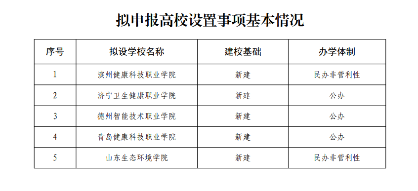 昨日山东省教育厅发布重磅公示——《关于拟申报高校设置事项的公示》,标志着山东高等教育布局再添新军!本次拟新增5所高校,涵盖健康科技、康养服务、数字经济等新兴产业领域,具体内容如下: