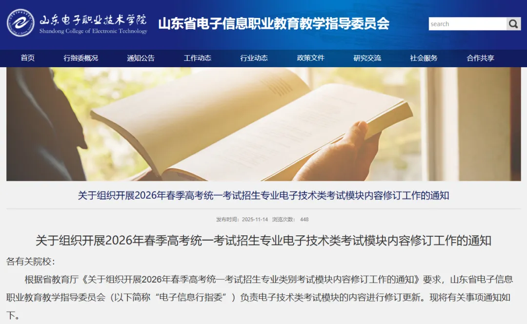 各有关院校: 根据省教育厅《关于组织开展2026年春季高考统一考试招生专业类别考试模块内容修订工作的通知》要求,山东省电子信息职业教育教学指导委员会(以下简称“电子信息行指委”)负责电子技术类考试模块的内容进行修订更新。现将有关事项通知如下。